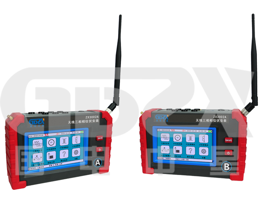 ZX3002A無線三相相位伏安表由2臺手持終端、6個電流鉗、2組電壓測試線等組成,手持終端具有5英寸觸摸彩屏,中文界面,大容量鋰電池,USB接口。單機具有三相伏安表、PT負荷測試、CT負荷測試、三相不平衡度測試、諧波分析等功能。雙機具有無線三相相位伏安表、無線PT核相等功能。采用GPS衛(wèi)星授時及LORA無線通訊技術,確保同步測試更準確。四機同時使用時,可將一臺設置為主機,另三臺設置為從機,特別適合多點同步測試,使用靈活方便。儀表帶有藍牙通訊,安裝APP后可在手機進行測試或查看測試記錄。在變電站內不同位置無線同步測量電流、電壓、相位、頻率等電力參數(shù),無線PT核相,負荷測試、三相不平衡度測試、諧波測試。